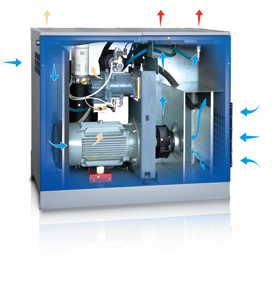 压缩机冷却系统由安装在主电机上的大排量风扇提供冷却风量,无需另装专门的冷却风扇,减少运动部件,降低故障因素,使机器运行更加可靠。