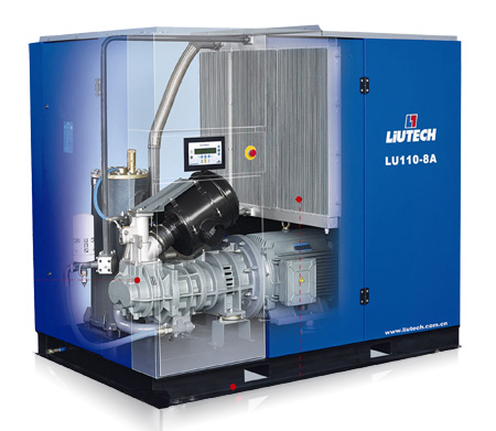 · 弹性直联传动系统 · 螺杆主机 2、运动部件材质优良,加工精度高,整机噪音仅为76分贝. 3、LU90-132 A 系列压缩主机具有极佳的螺杆线 速度及很高的压缩效率,比市场上同类产品节能10%以上.